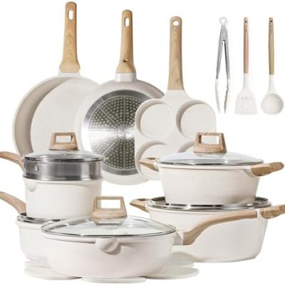 CAROTE 21Pcs Pots and Pans Set, Nonstick Cookware Sets, White Granite Induction Cookware Non Stick Cooking Set w/Frying Pans & Saucepans(PFOS, PFOA Free)
